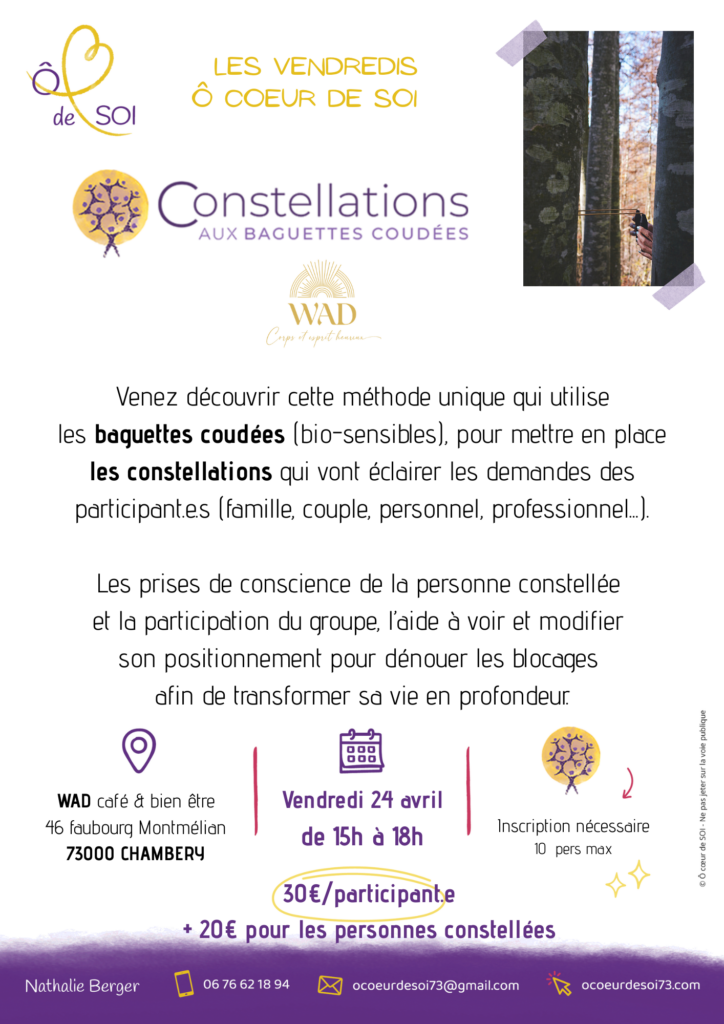 Venez découvrir cette méthode unique qui utilise les baguettes coudées (bio-sensibles), pour mettre en place les constellations qui vont éclairer les demandes des participant.e.s (famille, couple, personnel, professionnel…).