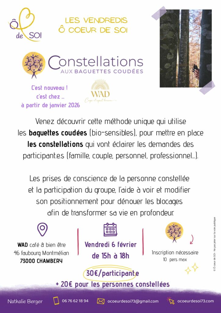Venez découvrir cette méthode unique qui utilise les baguettes coudées (bio-sensibles), pour mettre en place les constellations qui vont éclairer les demandes des participant.e.s (famille, couple, personnel, professionnel…).