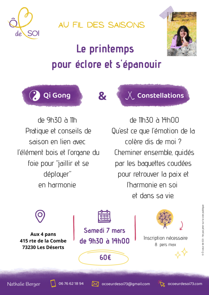 Au programme : 9h30 à 11h Qi-Gong et 11h30 à 14h Constellations